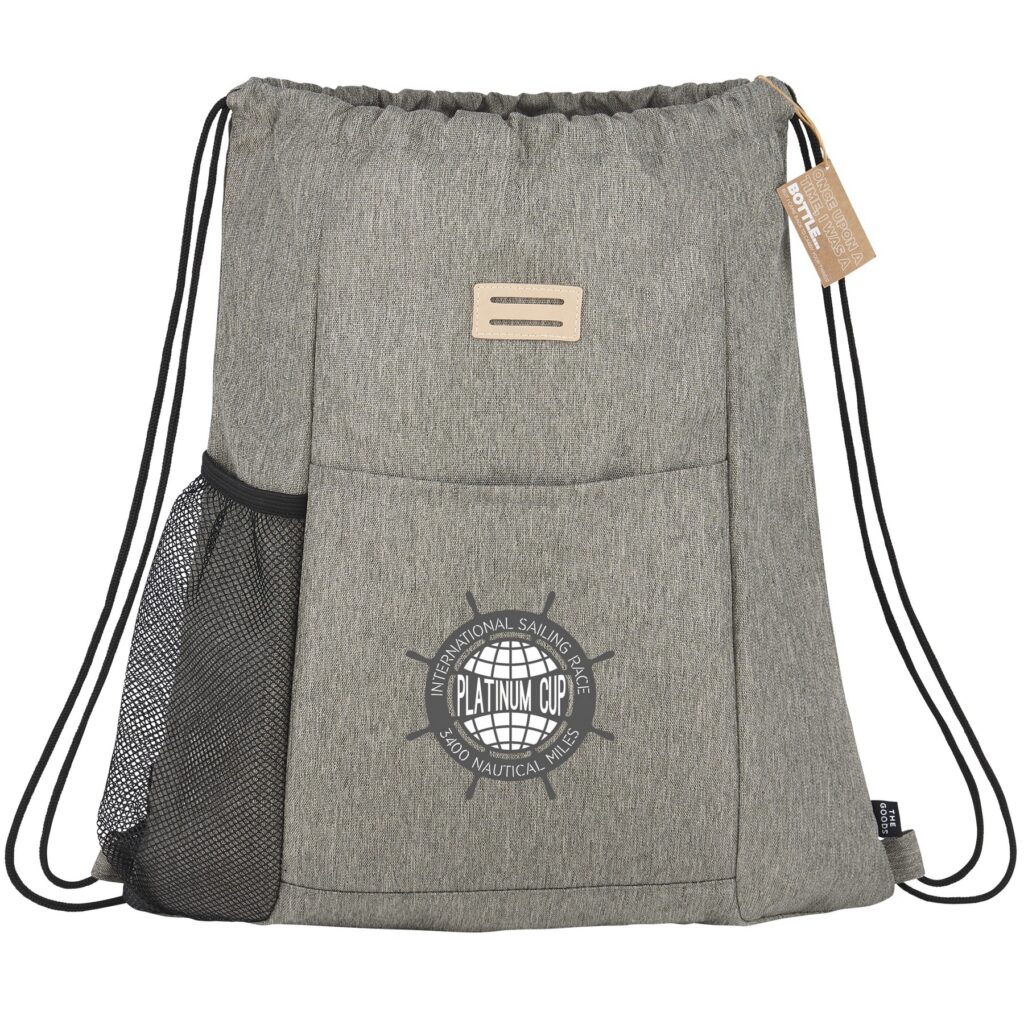 The Goods Recycled Drawstring is made from 600D RPET. This drawstring features a front slash pocket and a mesh side water bottle pocket.