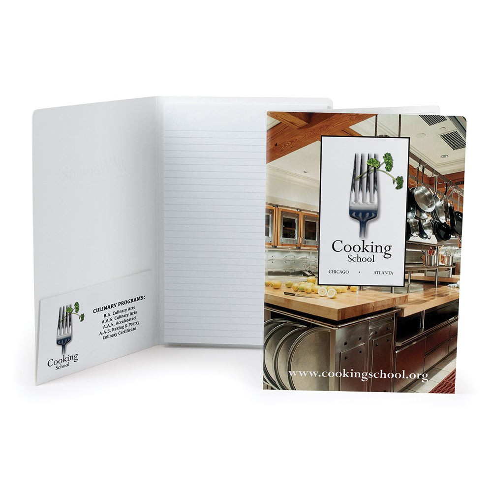 Measuring a convenient swag-bag sized 6-1/2″ x 9-1/2″, this unique promotional piece is a presentation folder and folio in one package.