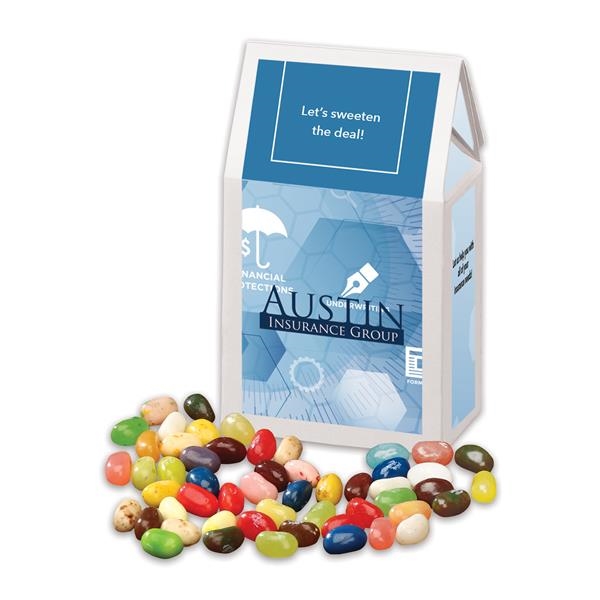 These are America’s favorite jelly beans! The white gift box contains one-half pound of an assortment of 50 unique flavors of the famous Jelly Belly® jelly beans, including cappuccino, piña colada, strawberry cheesecake, and watermelon. Your logo or promotional message is printed on the gift box in full color.